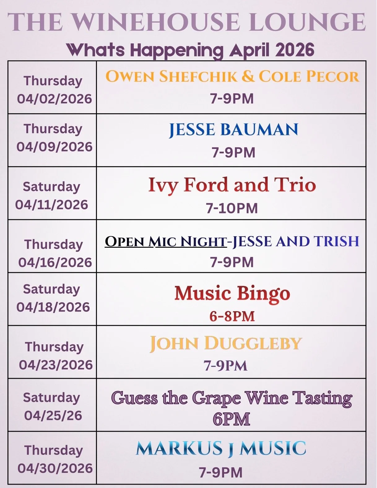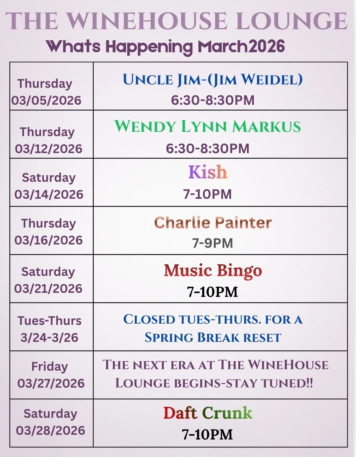 Join us every Wednesday at 6:30pm for an exciting Trivia Night at The WineHouse! Gather your friends, put your knowledge to the test, and compete for fun prizes in a lively atmosphere. Best of all, it’s completely free to participate! Whether you're a trivia pro or just looking for a fun midweek activity, everyone is welcome. Don’t miss out on a night of entertainment, good company, and great prizes!